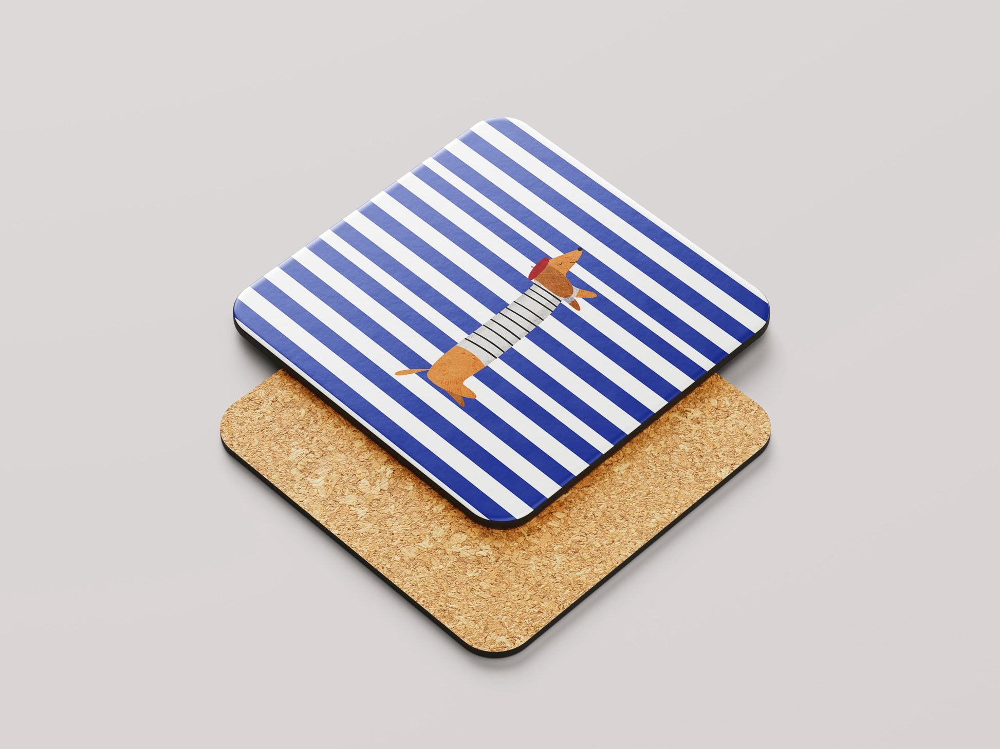 Deze handgemaakte onderzetter toont een charmante teckel in klassieke Franse blauw-witte strepen. Perfect voor elke hondenliefhebber die van stijl en functionaliteit houdt.