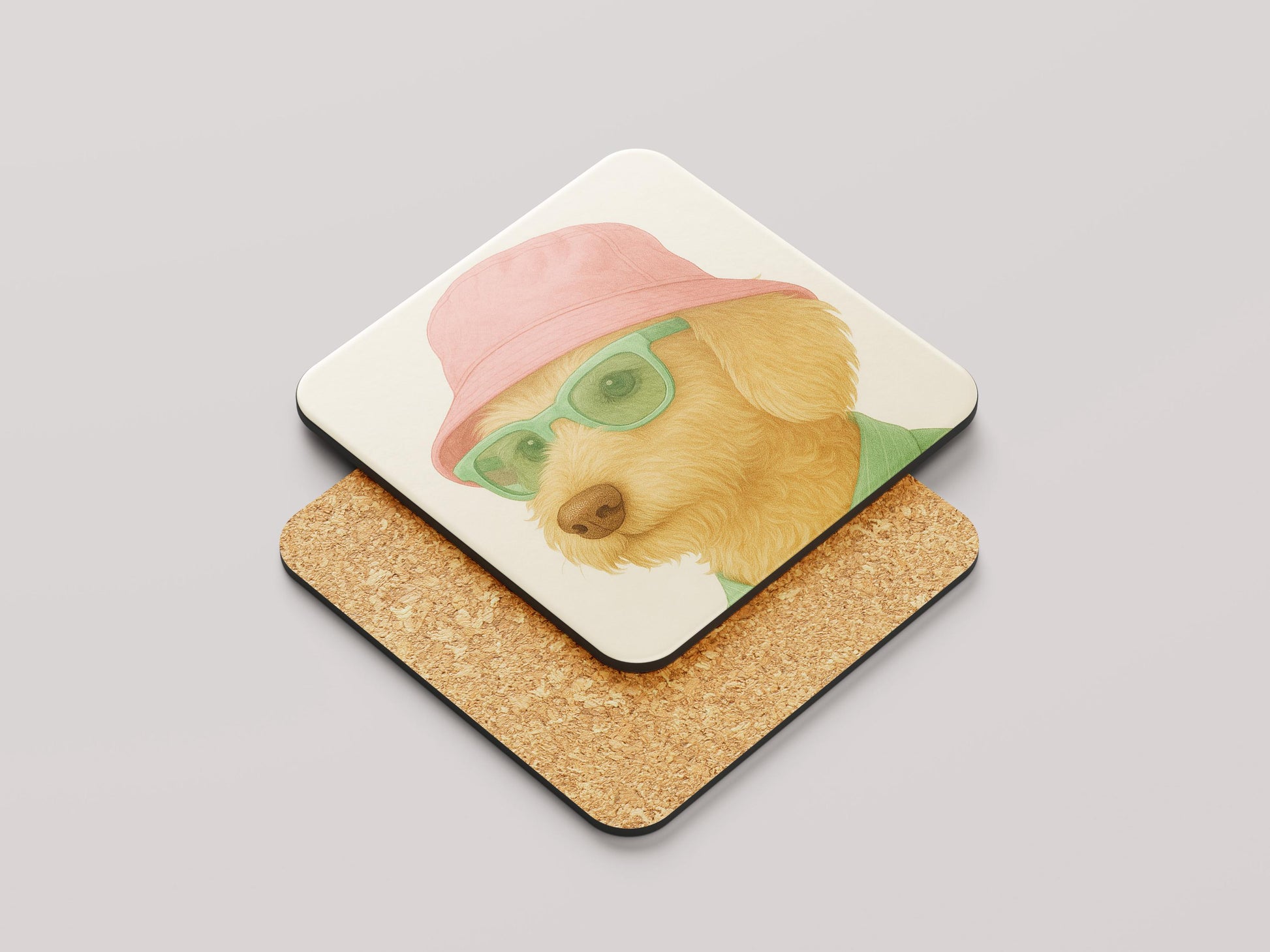 Deze super grappige onderzetters tonen een ruwhaar blonde teckel met een roze hoedje en coole mint zonnebril - de perfecte combinatie van schattig en stylish!