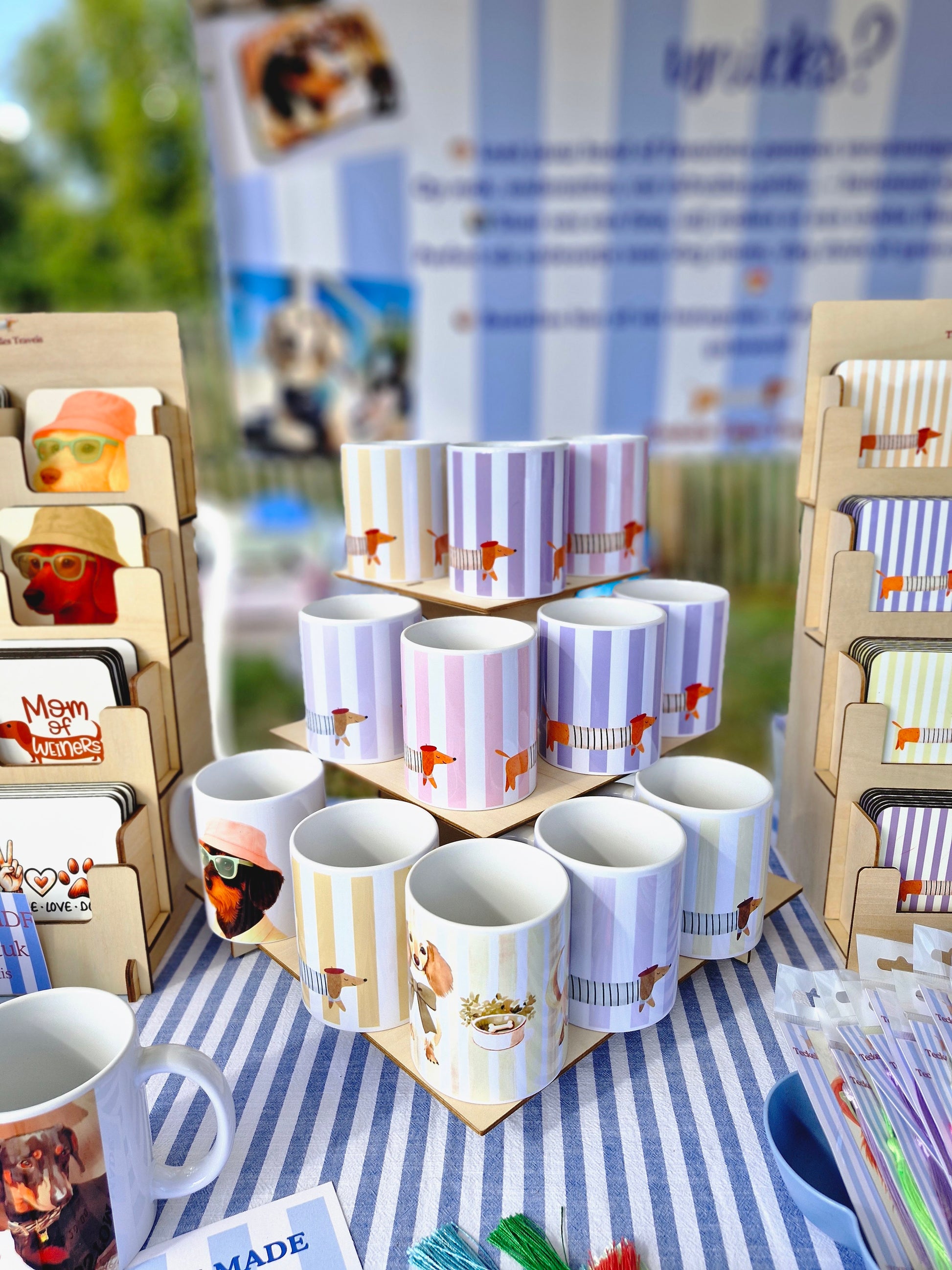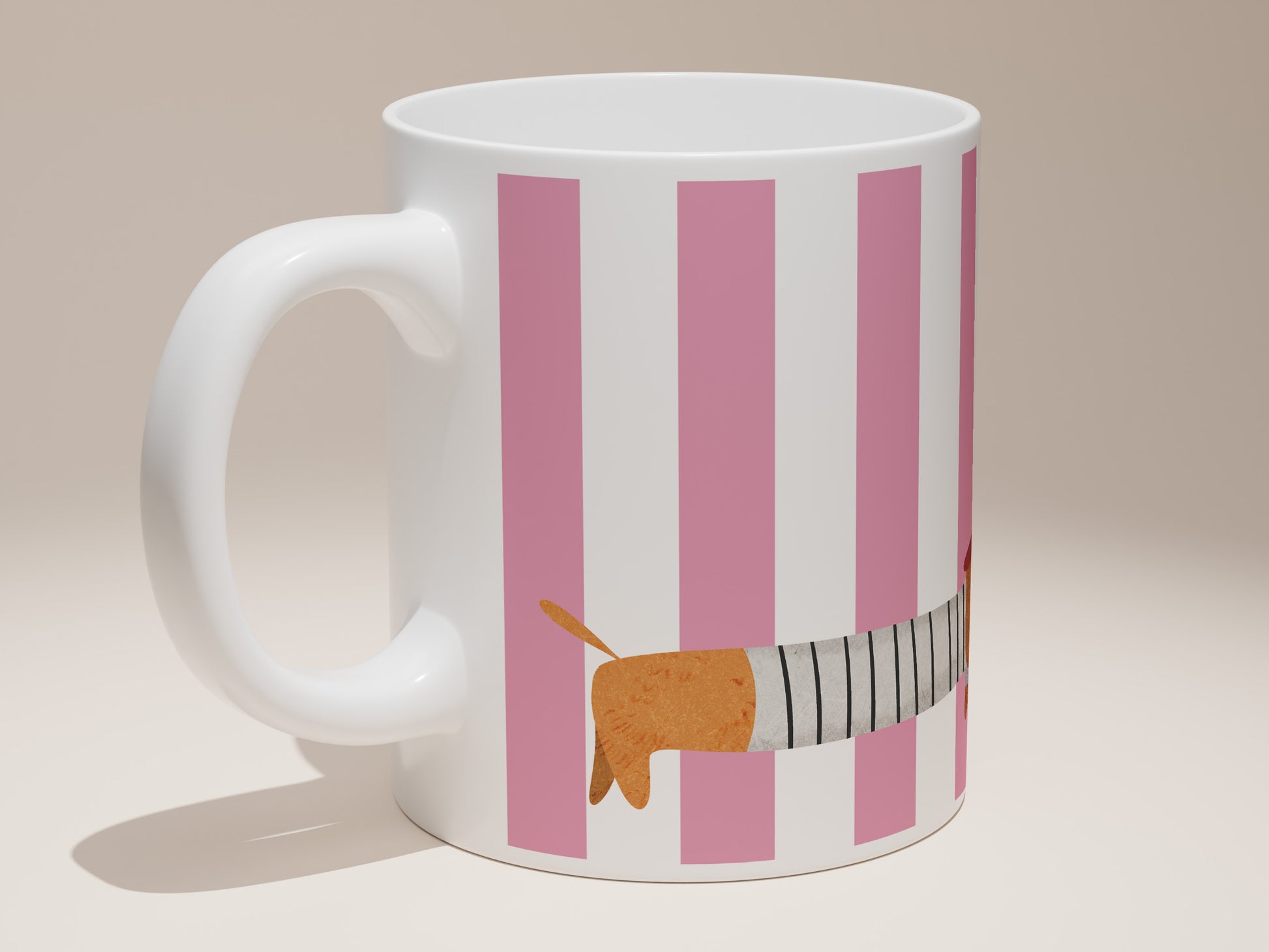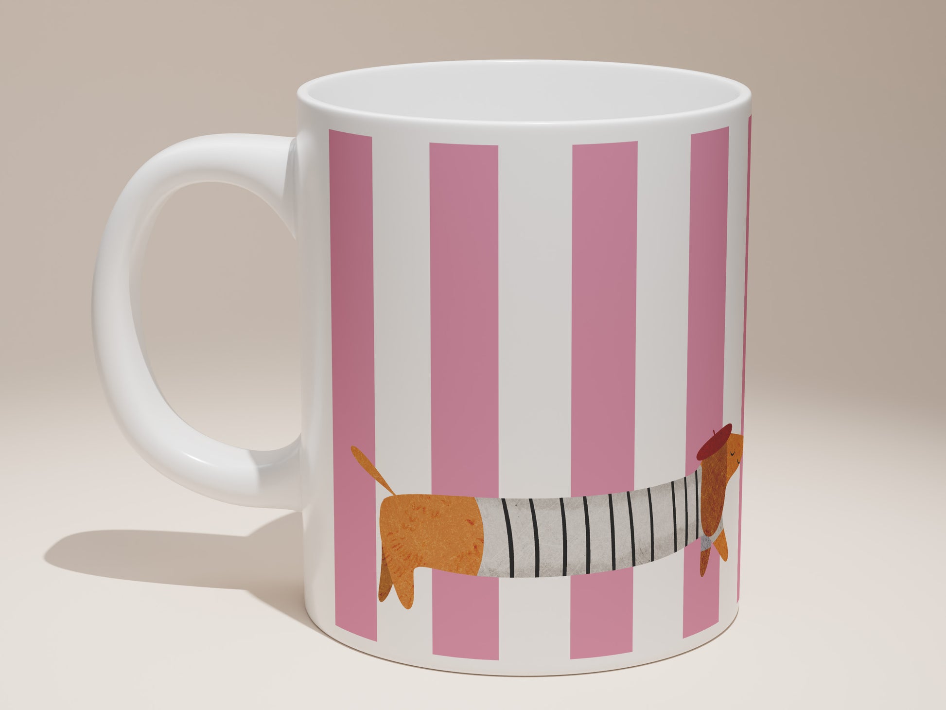 Deze prachtige keramiek mok toont de handgetekende La Saucisse Parisienne illustratie in een speelse roze en witte gestreepte stijl. Perfect voor elke hondenliefhebber die houdt van Franse elegantie!
