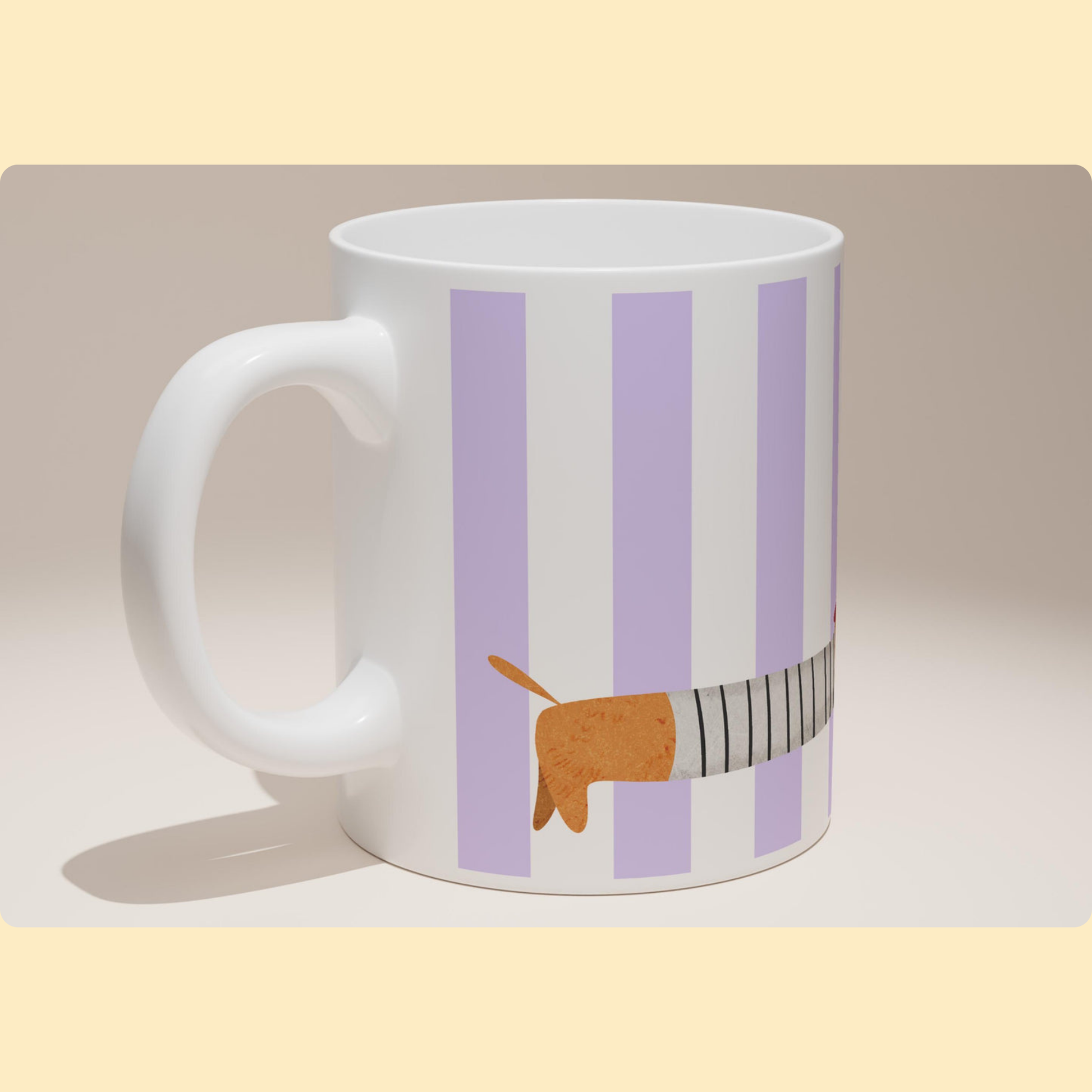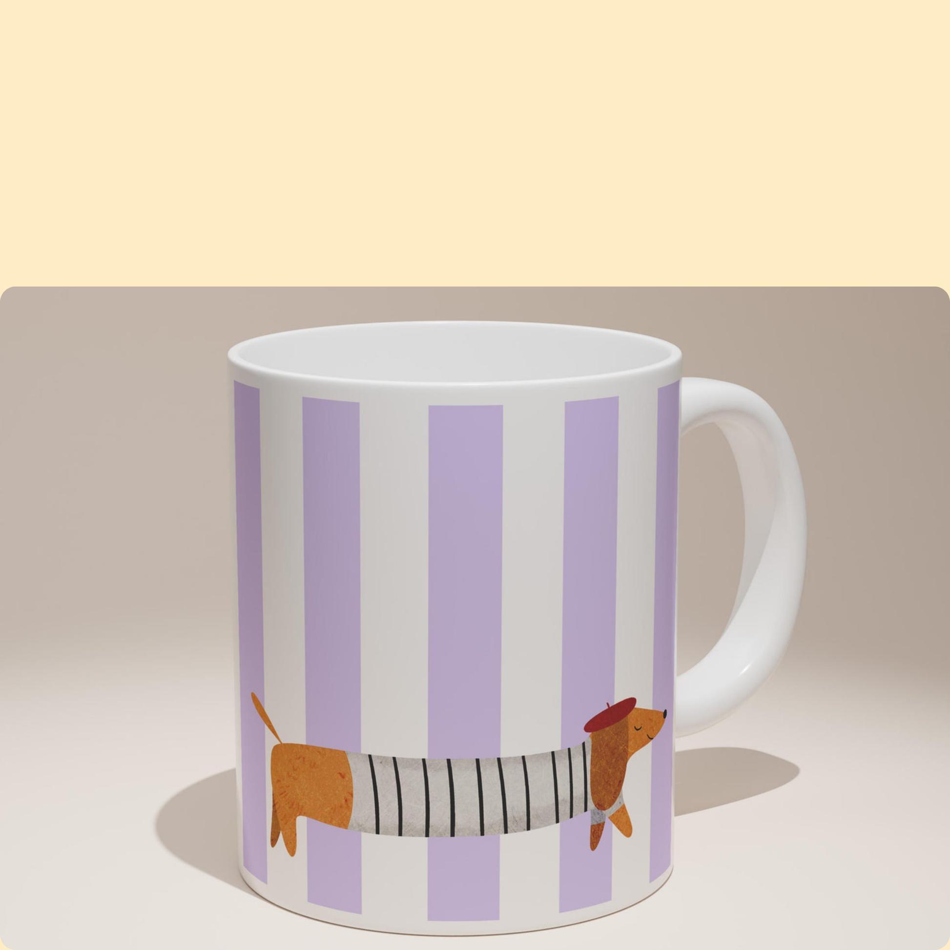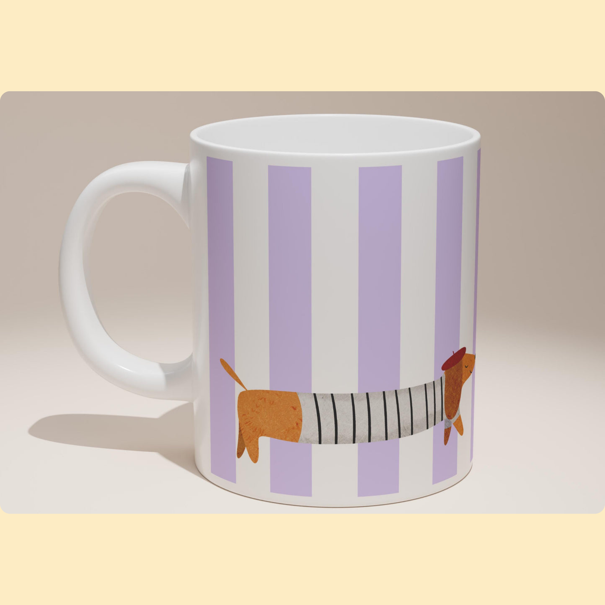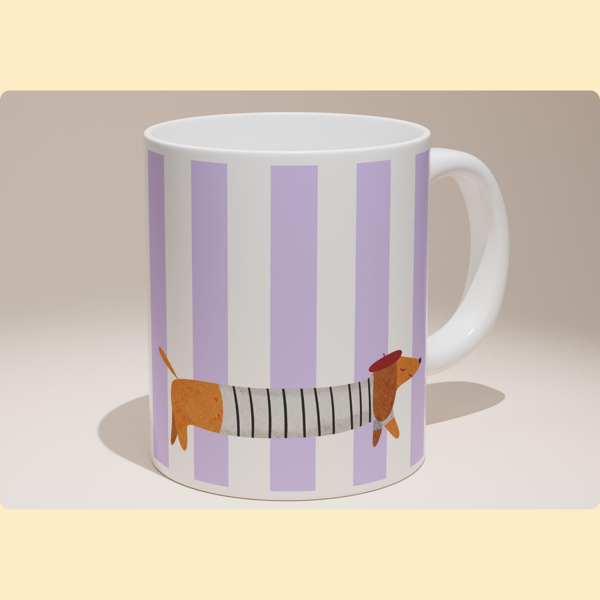 Ontmoet La Saucisse Parisienne – een elegante mok met een stijlvolle teckel in een klassieke Franse gestreepte outfit, compleet met een chique baret. De zachte lila strepen geven een verfijnde maar speelse touch.