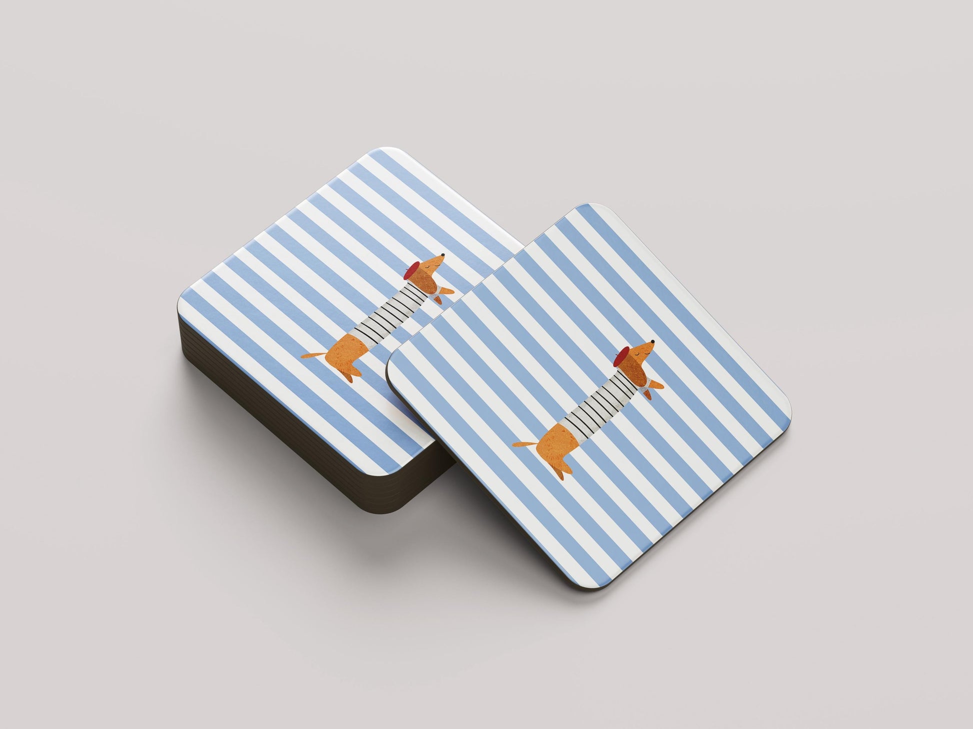 Breng de elegantie van Parijs in je huis met deze prachtige lichtblauwe onderzetter met charmante teckel illustratie! Perfect voor elke hondenliefhebber die houdt van stijl en kwaliteit.