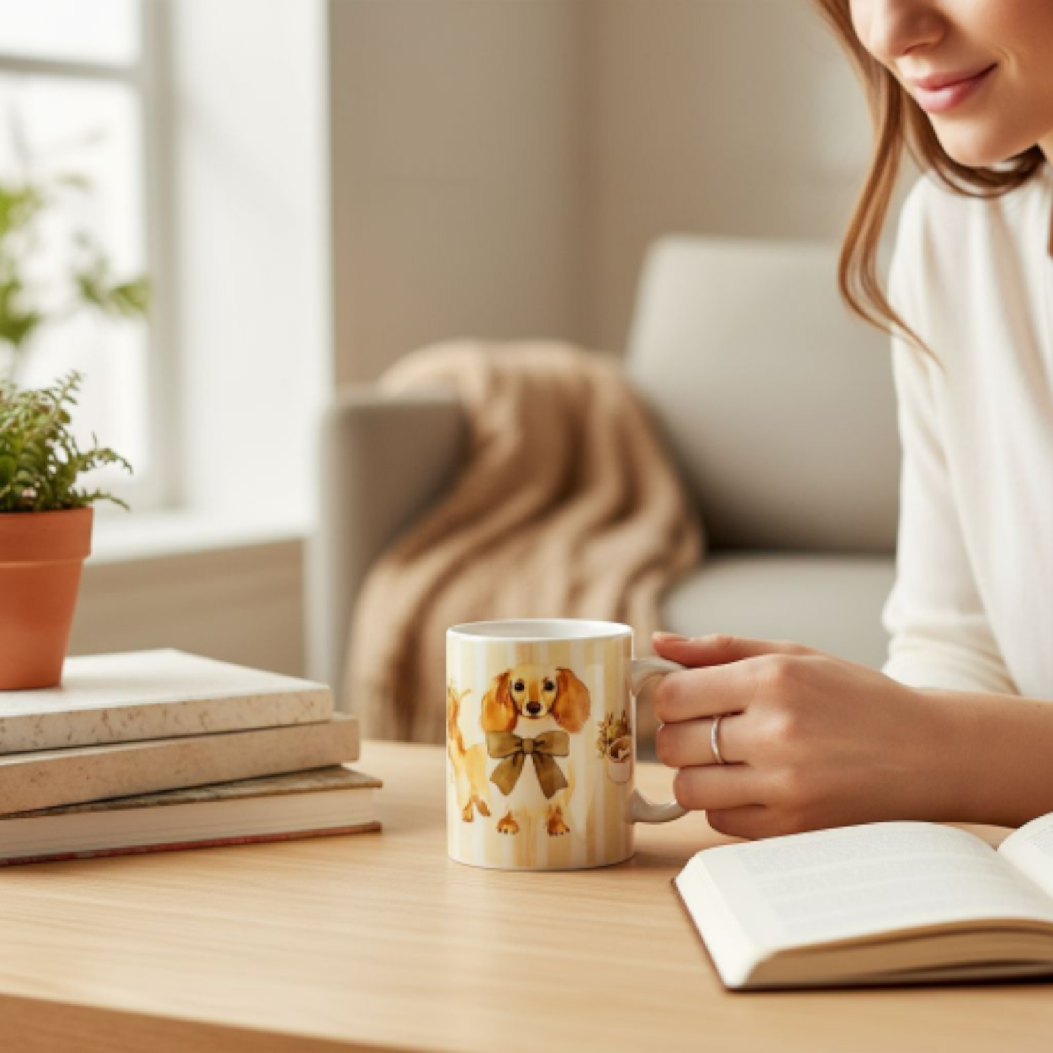 Deze prachtige mok met een langharige blonde teckel en elegante beige strepen is perfect voor elke teckelliefhebber die van stijlvolle en warme momenten houdt!