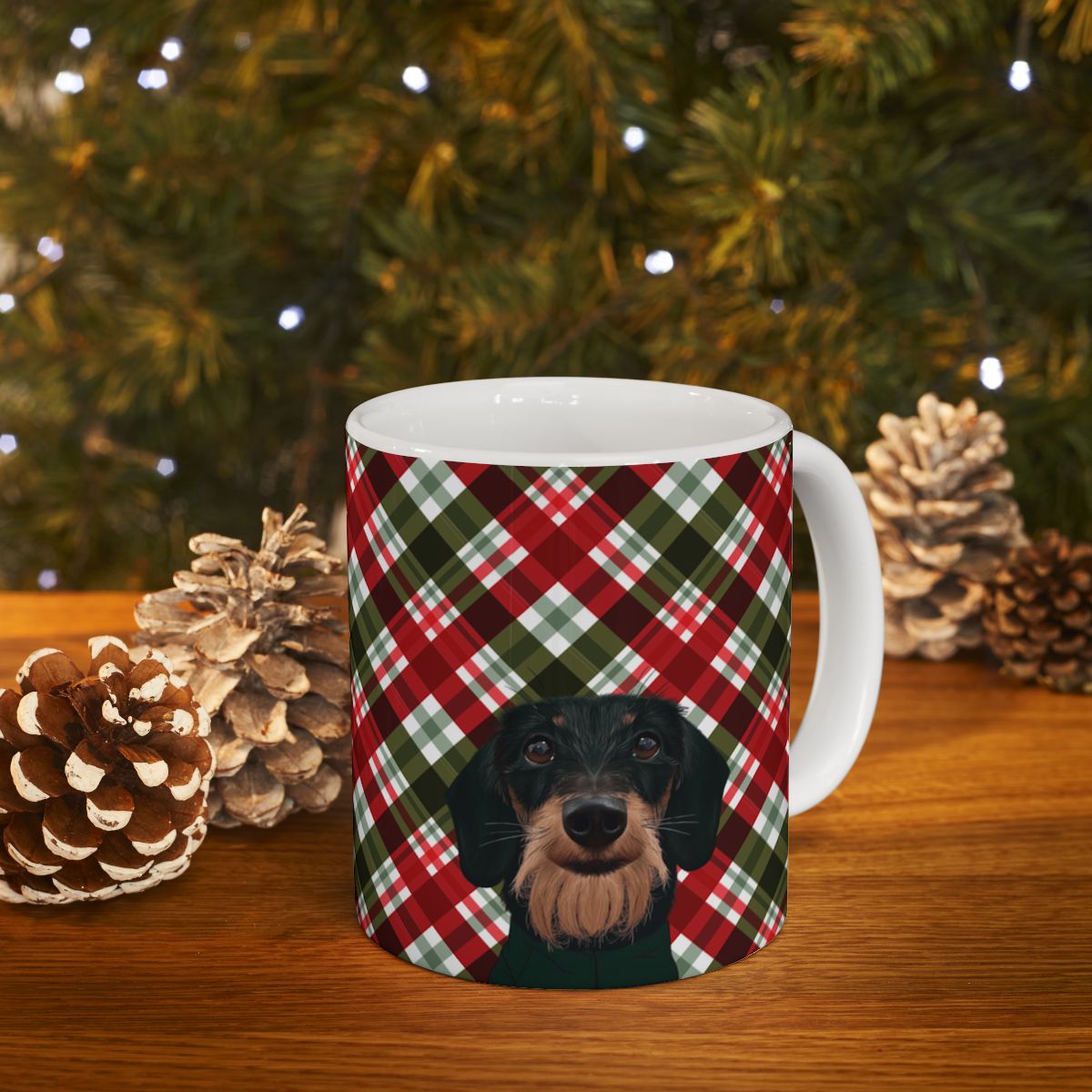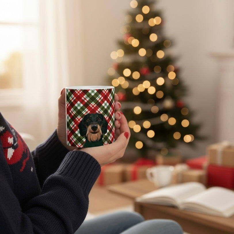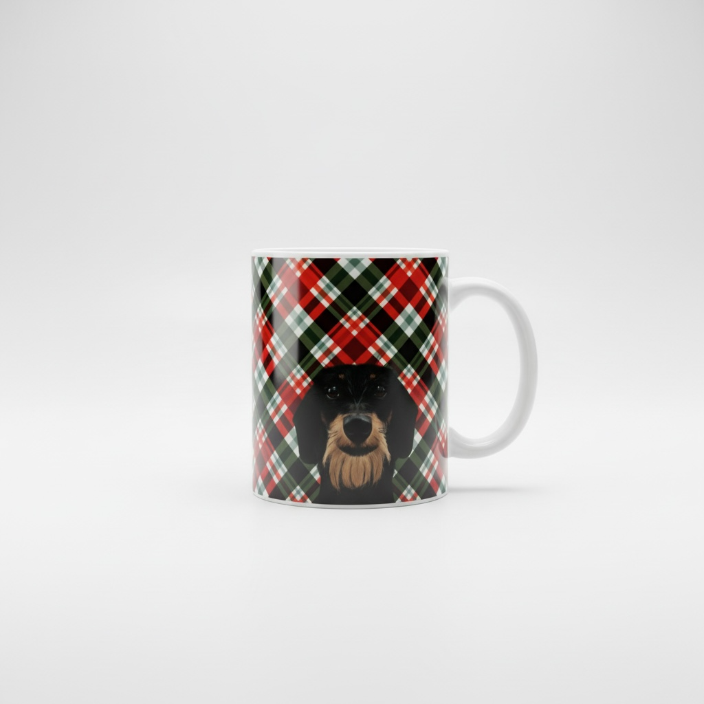 Deze stijlvolle ruwhaar teckel mok toont een prachtige illustratie van een wire haired dachshund op een klassieke geruite achtergrond in rood, groen en wit. Het realistische portret gecombineerd met het tijdloze ruitpatroon maakt deze mok perfect voor elke gelegenheid.