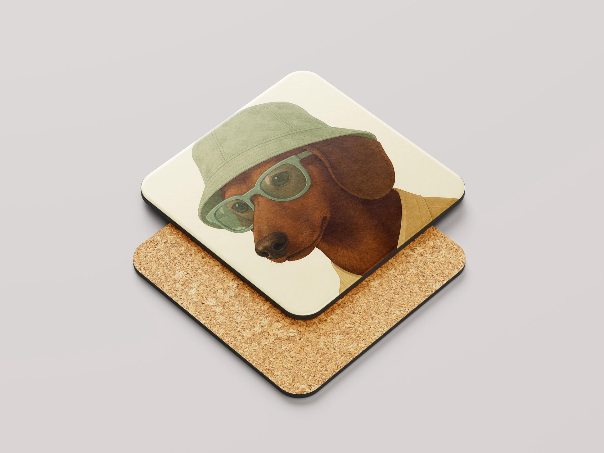 Deze adorable onderzetters set toont een gladhaar chocolate teckel met een trendy groene hoed - perfect voor liefhebbers van deze prachtige teckel kleur! Verkrijgbaar als set van 1, 2 of 4 stuks.