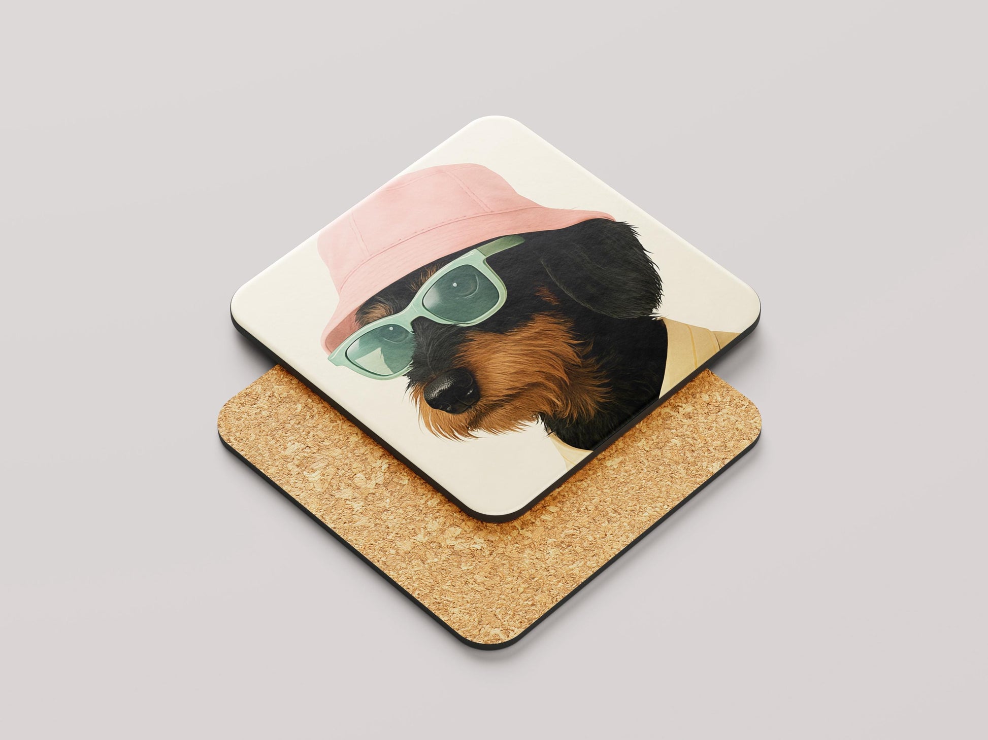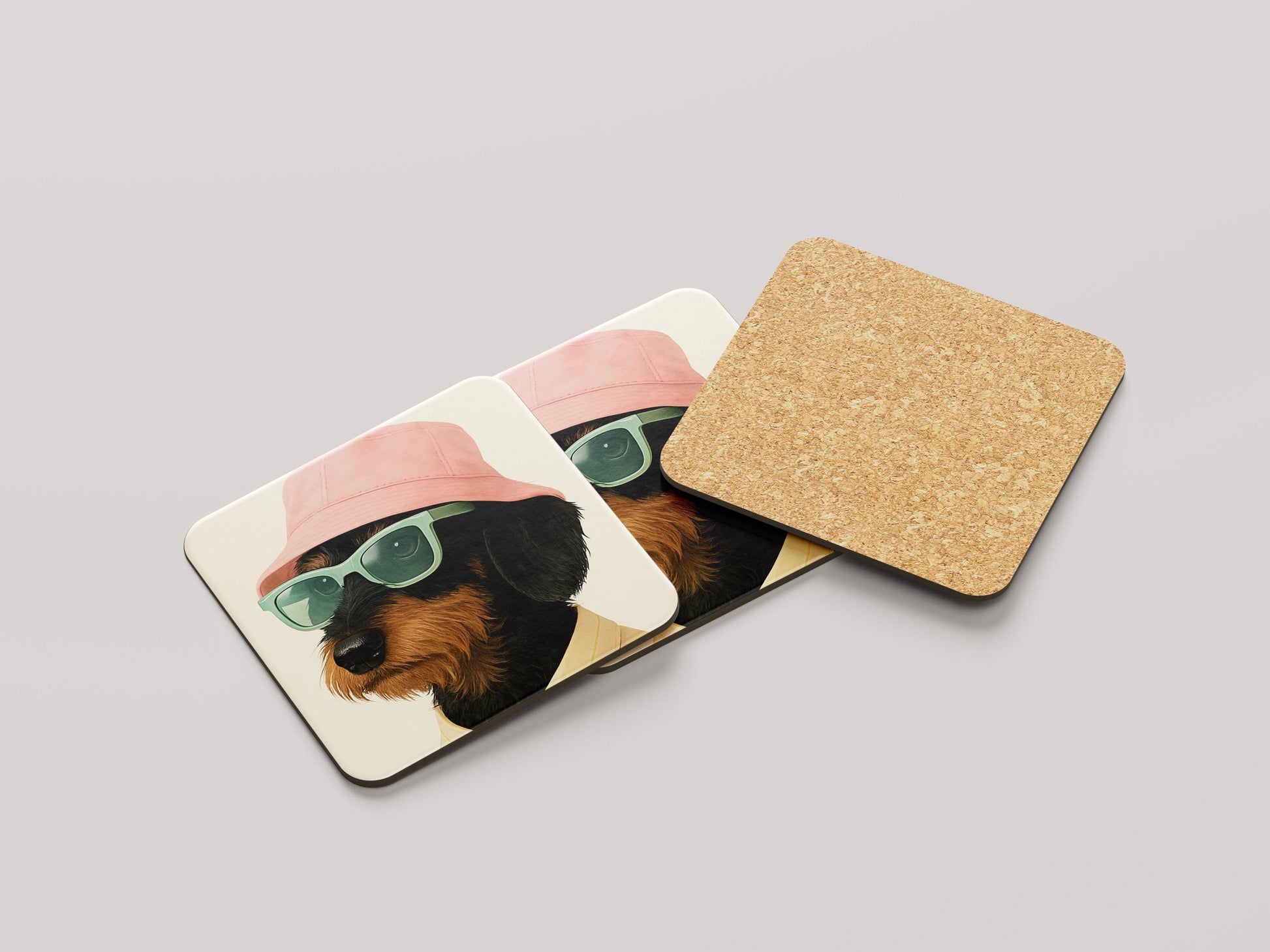 Stel je voor hoe deze vrolijke onderzetters je koffietafel opfleuren. Elke keer dat je je favoriete drankje neerzet, kijk je naar dit schattige ruwhaar teckeltje met zijn roze hoedje. Een klein detail dat je dag een beetje vrolijker maakt!