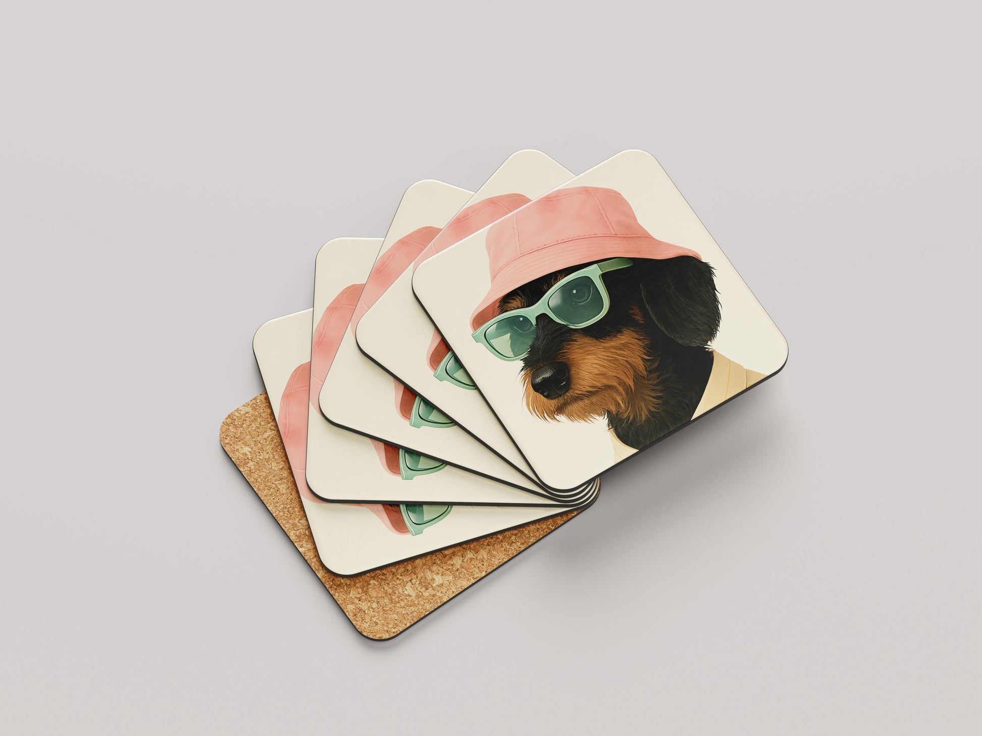 Verras jezelf of een dierbare met deze schattige ruwhaar teckel onderzetters! Met hun charmante roze hoedje en kurk achterkant zijn ze zowel praktisch als onweerstaanbaar leuk.