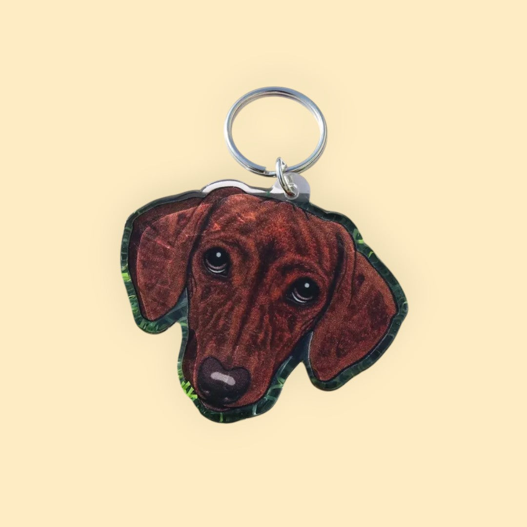 Deze teckel kop sleutelhanger toont het karakteristieke hoofd van een chocolade korthaar teckel in prachtig detail. Perfect voor teckelliefhebbers die hun passie voor deze unieke honderassen willen tonen.
