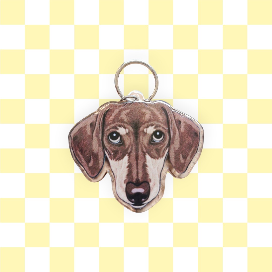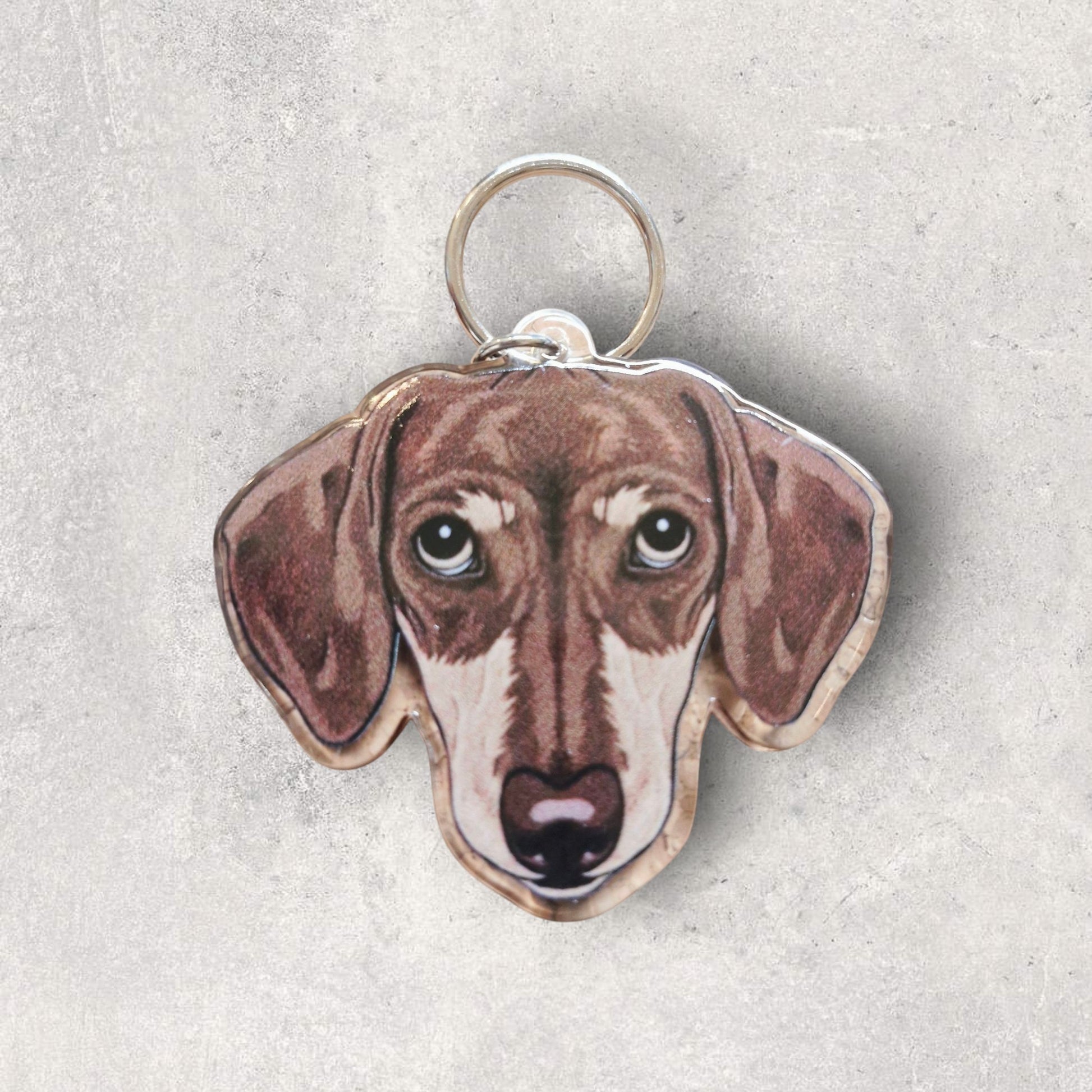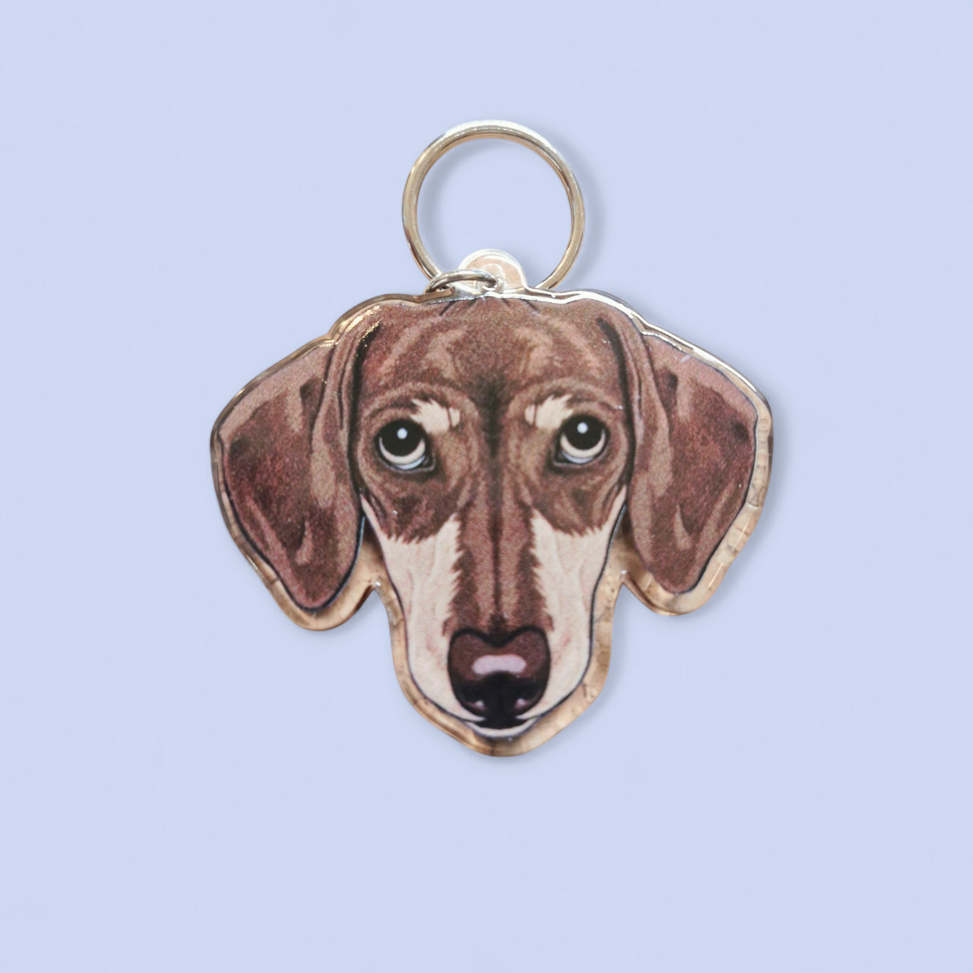 Ontdek deze prachtige teckel kop sleutelhanger met een authentiek brown & tan korthaar teckel hoofd! Deze unieke keychain vangt perfect de warme, klassieke kleuren van deze geliefde teckel variant en toont de karakteristieke uitdrukking die elke teckelliefhebber direct herkent.