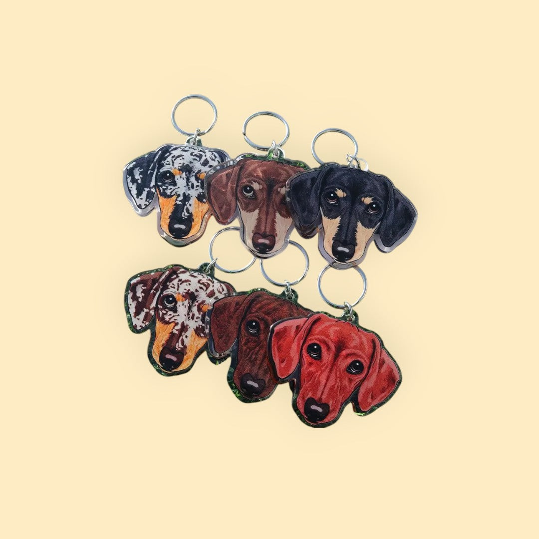 🐕 Unieke Teckel Kop Sleutelhanger - Bruin-Zilver Merle (Dapple) Patroon